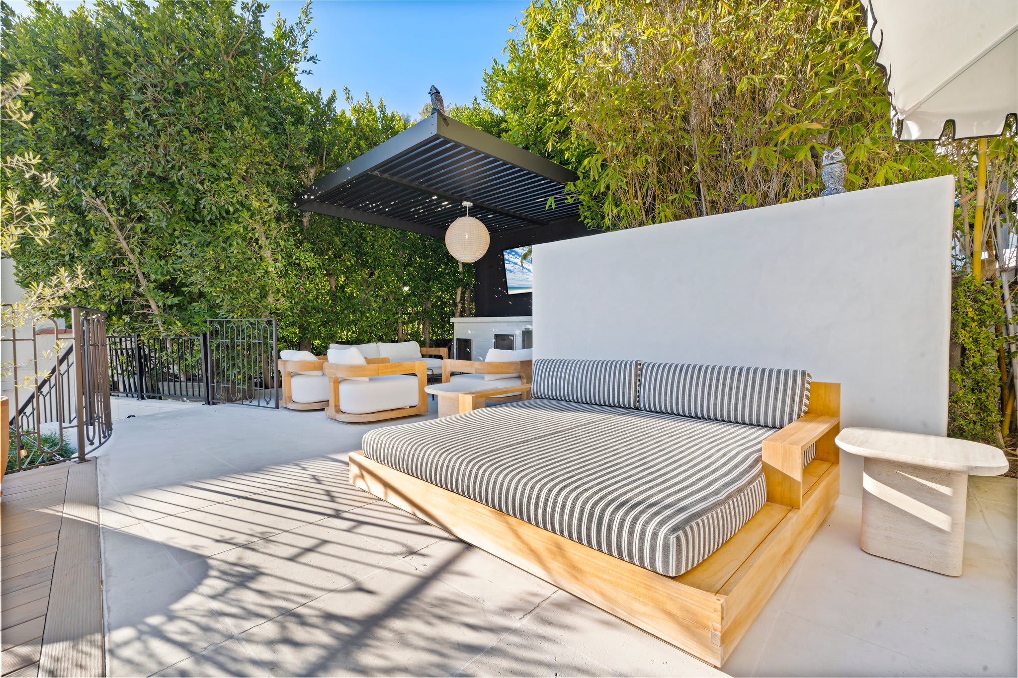 • Covered outdoor lounge with pergola, TV, bar seating, and custom BBQ